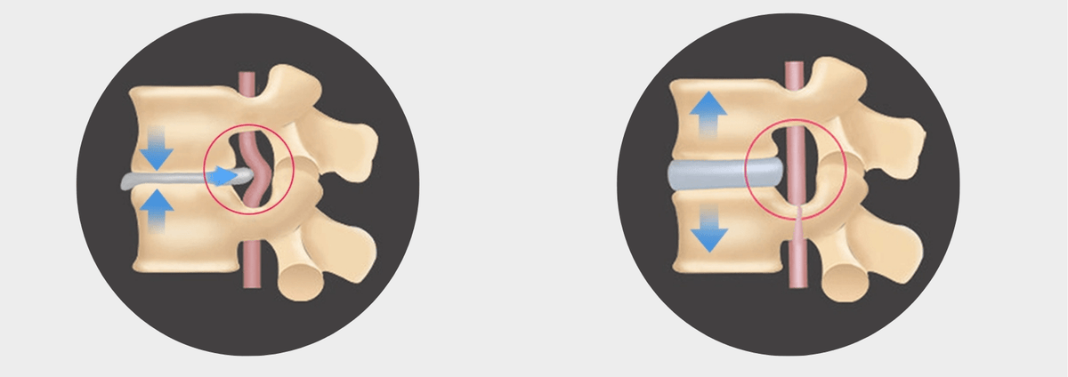 Durch die Befestigung unter dem Brustkorb und über dem Becken wird beim Aufblasen der untere Rücken nach oben und unten gedehnt. Dies leitet die tragende Kraft vertikal um. So wird der Druck im unteren Rücken verringert, was Rückenschmerzen durch Kompression (Nerven und Nervenbahnen) erheblich reduzieren kann.